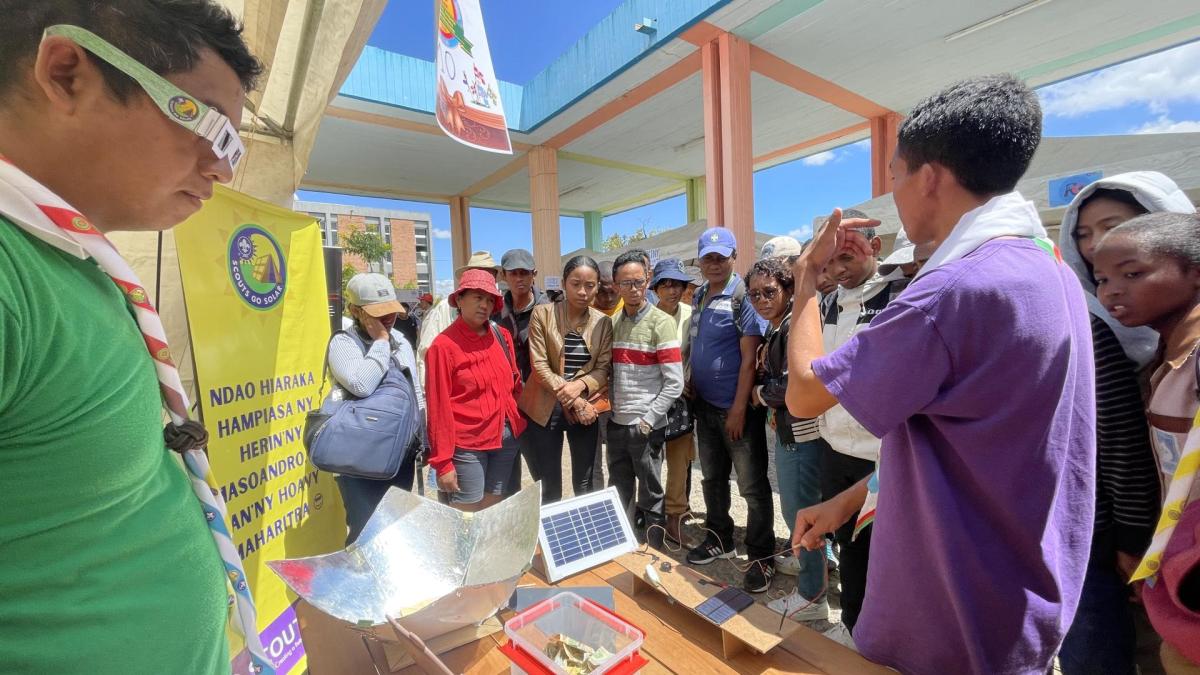 L'exposition s'est tenue dans la capitale à Antananarivo durant une foire scoute, au Plaza Ampefiloha, pour la célébration de la centenaire des Scouts Catholiques "Antilin'i Madagasikara". Dans un premier temps, j'ai mobilisé le comité jeune pour aider lors de l'exposition. On a tenu une séance de debrief pour expliquer et comprendre les enjeux du programme Scout Go Solar. Aussi, nous avons fait une deuxième séance pour préparer le matériel et les jeux qu'on a exposé. Ainsi, les jeunes ont pu prendre en charge avec moi l'exposition sur la partie théorique. De mon côté, j'ai pu prendre plus part sur les côtés pratiques et techniques du programme (fabrication lunettes solaires, solar cookers expo, jeux, etc).