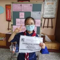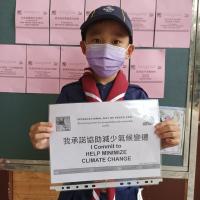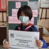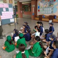 幼童軍們於朝會時間,向全校喊話,傳達和平、減塑的觀念,用小小力量可以擰成一股巨繩!