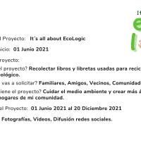 El impacto de Cuidar el medio ambiente y crear más áreas verdes dentro de los hogares de mi comunidad. I'ts all about EcoLogic fue mi proyecto enfocado a la ecología y trabajé con la asociación Gorras Verdes AC que por medio de actividades busca hacer conciencia para la conservación y restauración ambiental. Mi proyecto es reciclar las libretas y libros usados y hacer un intercambio ecológico, por las libretas ó libros usados que se entreguen para reciclar se va a dar una semilla o plantita.