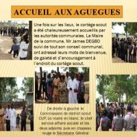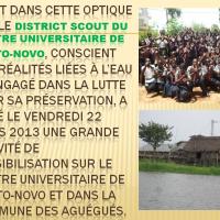 Au Bénin certaines populations bâtissent leurs habitations sur l’eau : c’est le cas des habitants de la commune des Aguégués dans Région Ouémé-Plateau. Les maisons des habitants de cette commune sont faites d'habitations traditionnelles sur pilotis disposés en agglomération. La principale difficulté de ces habitants est l’approvisionnement en eau potable bien qu’ils vivent sur l’eau. Il est difficile d'aller chercher l'eau avec les récipients dans une pirogue à des distances allant parfois à plus de deux kilomètres de chez soi d'où la tentation très élevée à vouloir se servir de l'eau impropre de la rivière qui est à proximité. De même, les inondations et les maladies d'origine hydrique sont autant de constats qui confirment que cette population est confrontée à d'énormes difficultés pour s'approvisionner en eau potable. Dans le but d’aider cette population lacustre à éviter les maladies hydrique auxquelles elle est fréquemment confrontée les scouts du centre universitaire de Porto-Novo ont décidé d’aller la sensibiliser sur les comportements à adopter. La mission a été réalisée en trois étapes. La première, la mobilisation du matériel nécessaire pour la mise en œuvre de l’activité et la descente sur le terrain pour rencontrer les autorités locales afin d’obtenir leur adhésion à l’activité et bénéficier de leur appui. La seconde une cérémonie officielle de lancement de l’activité suivi d’une conférence débat pour mieux outiller les participants sur la question.la troisième fut la descente dans les villages pour la sensibilisation et la distribution des comprimés qui servent pour la désinfection de l’eau.