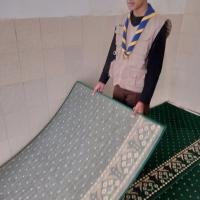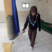 Setelahnya sampai di masjid kita mulai berbagi tugas, ada yang kebagian tugas menyapu halaman luar mesjid, menyapu dan menggulung karpet masjid, melipat sejadah.