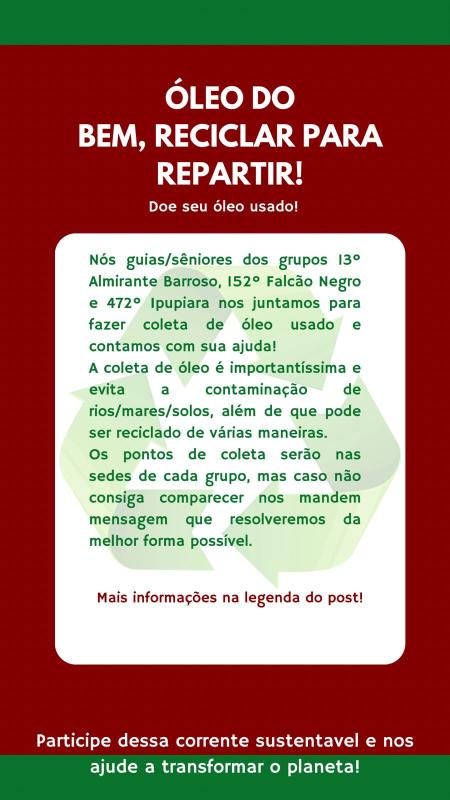 Nós guias/seniores dos grupos 13º Almirante Barroso. 152° Falcão Negro e 472° Ipupiara nos juntamos para fazer coleta de óleo usado. Durante 2 meses, fizemos anúncios e mostramos a todos a diferença que podemos fazer com essas pequenas atitudes, então fizemos várias parcerias com restaurantes, recebemos doações de familiares, amigos e outros grupos e iniciamos nosso projeto de troca de petróleo para o básico. No final, foram 190L de petróleo foi coletado que deu cerca de R$570.00 reais