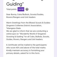 Online Quiz on "Wonderful World of Singareni Scouting & Guiding'': https://forms.gle/NyA3BqjtiLxuXWWR8
