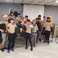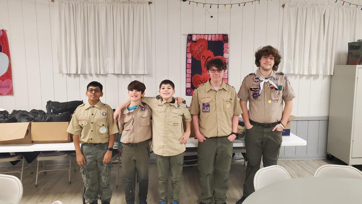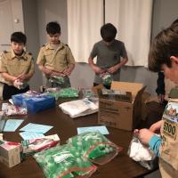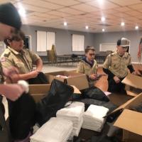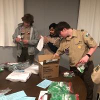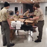 My Troop made 100 toiletry kits and 50 cold weather bags for people in need. The cold weather bags included a blanket, hat, gloves, scarf, bath towel and socks. The toiletry kits had soap, shampoo, a comb, shaving cream, razor, deodorant, and wash cloth. My Dad's company offers grants to help community projects so I wrote up the paperwork to get it. The Scouts put the kits together at a meeting. Then we went to the Community Luncheon to hand out the kits and help serve lunch.