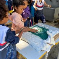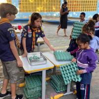 Coleta do material: cada criança e os escoteiros buscaram caixas de ovos vazias que seriam descartadas. As estações de preparação foram preparadas: corte do material, hidratação com água quente, trituração, adicão das sementes, remoção da água, formação da folha e secagem. As crianças da escola que preparam as folhas, sob a orientação dos escoteiros.