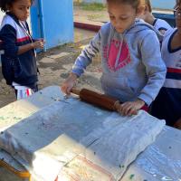 A divisão do trabalho em estações foi muito positiva. Cada grupo tinha funções específicas: uma criança cortava, outra amassava, e assim sucessivamente. Isso ajudou na organização e no engajamento de todos.