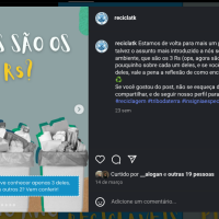 Criamos um perfil para publicação de informações na plataforma do Instagram. Realizamos pesquisas em materiais sobre os temas associados às postagens. Estas estiveram relacionadas a: Reciclagem do vidro, Descarte do vidro quebrado, de móveis usados, de remédios, de óleo de cozinha, de eletrônicos estragados, de cápsulas de café, de pilhas e baterias, de recicláveis sujos, de resíduos no Ano Novo, entre outros
