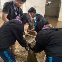 membersihkan lumpur lumpur pasca banjir yang berada di masjid, rumah warga, dan sekolah sekolah yang terendam banjir.