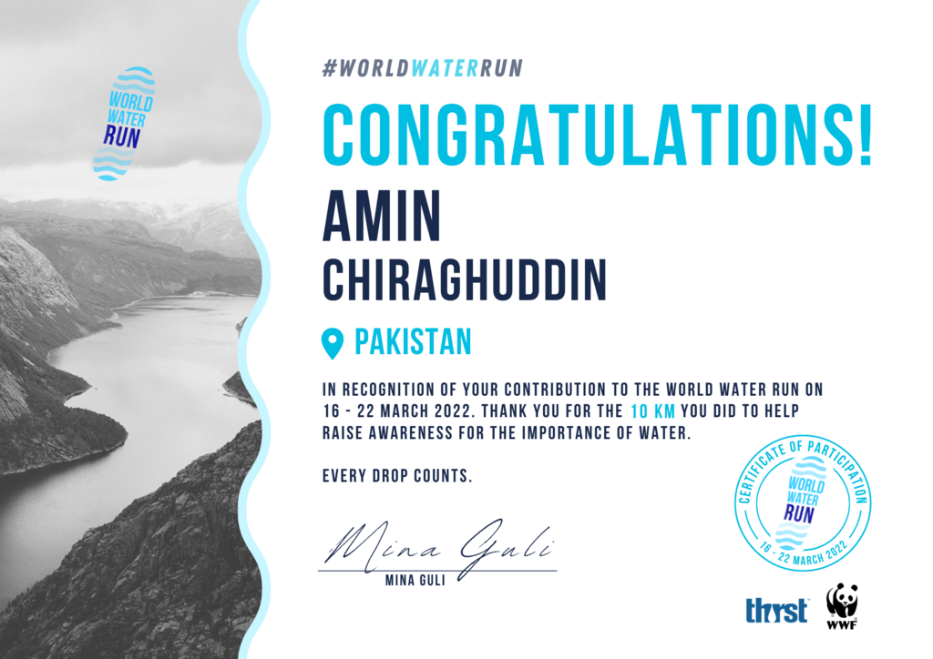 World Water Run was an international virtual run organized by Mina Guli. The event was held to create awareness to save water. Every participating individual was to use the hastag #worldwaterrun to create the awareness via Social Media Platform. Certificates were also issued via email.