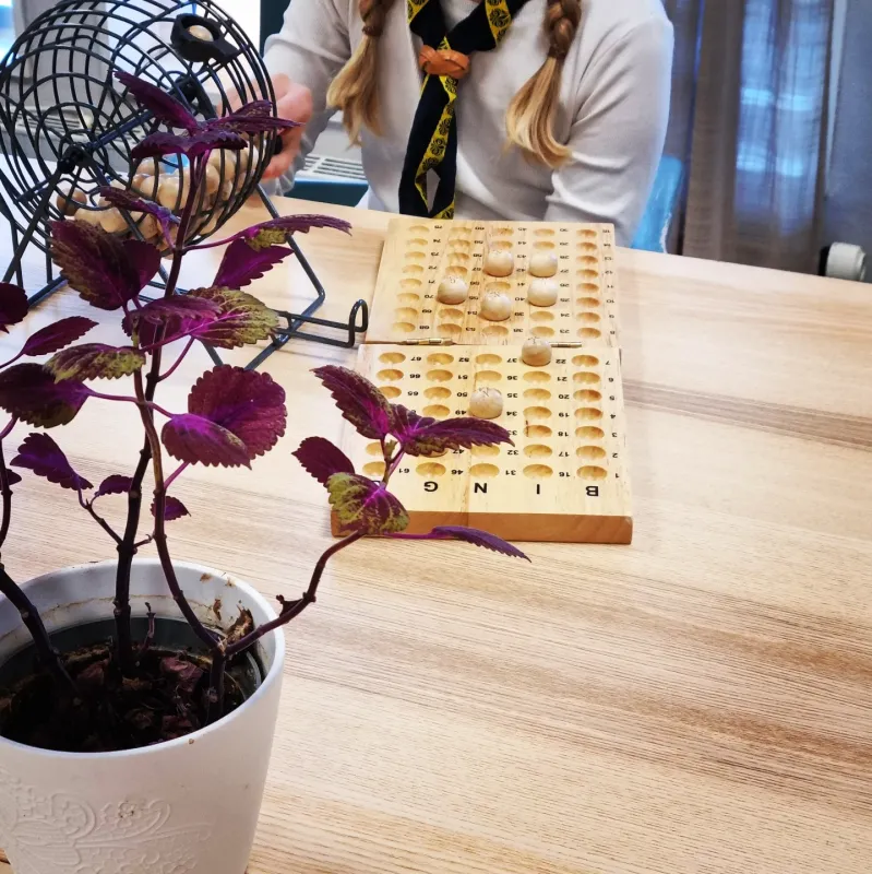 We got permission to come and visit the elderly with the scouts. We organized a collection, collected and stored lamps, light strings and battery driven candles. We did our visit on the 25th of October. We decorated the home with all the lamps and strings we collected, and we sat new curtains up. We hand-crafted greeting cards, savored a cup of tea/coffee with cookies and played BINGO.