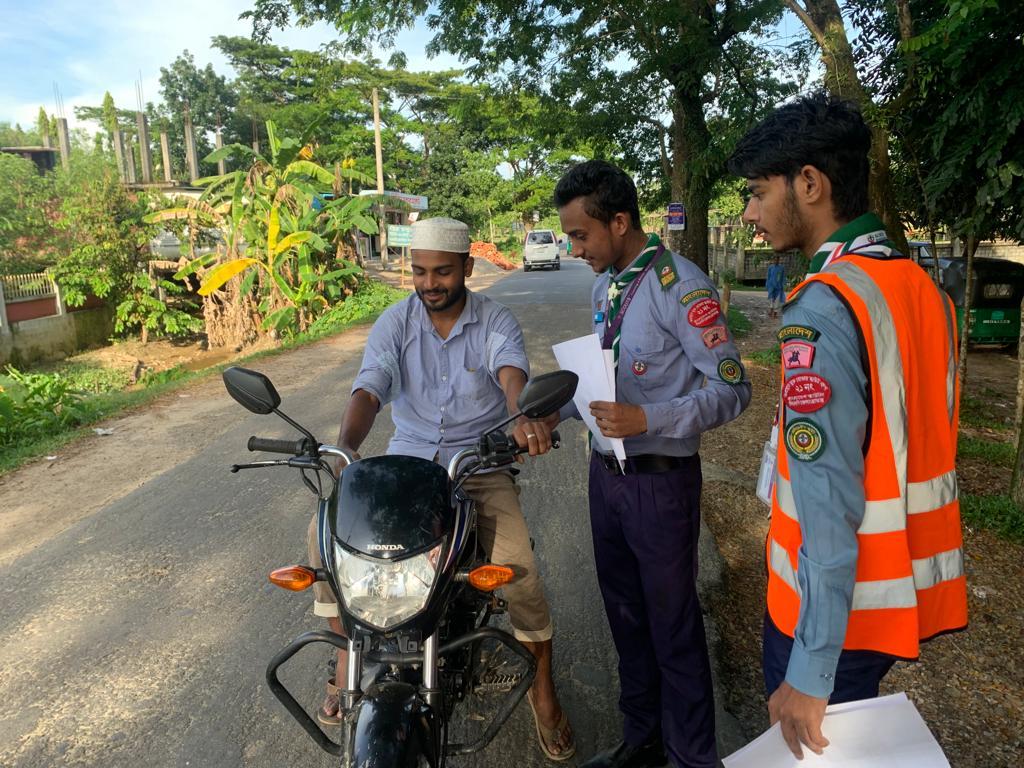তাই আমরা অগ্রদূত মুক্ত স্কাউট দলের ২০ জন স্কাউট ও রোভার স্কাউট নিয়ে লক্ষনাবন্দ ইউনিয়নের চৌধুরীবাজারের ব্যস্ত রাস্তায় এই কার্যক্রমটি বাস্তবায়ন করি। আমরা বিভিন্ন গাড়ির চালকদের ট্রাফিক আইন সম্পর্কে ধারনা দেই ও সচেতনতার জন্য লিফলেট বিতরণ করি। তাছাড়া পথচারীদের ফুটপাত ব্যবহার করার জন্যও সচেতন করি।