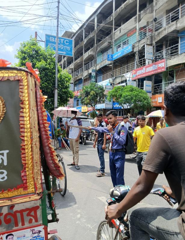 After the anti-discrimination student movement, in the absence of police, the smart Rovers of Bogura Polytechnic Institute Rover Scout Group worked to control traffic congestion.