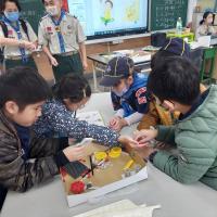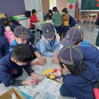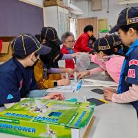 介紹說明甚麼是乾淨的能源?指不破壞、不危害環境及不排放污染物的能源。目前乾淨的能源有哪些?例如生質能、太陽能、海洋能、水力,太陽光電、風能、地熱等。簡述這些潔淨的能源期發電原理讓幼童軍有基本的認識;進一步採以問答方式,以啟發幼童軍的腦力激盪,所以本次活動以由淺入深的引導方式帶入結合實際操作課程,以加深童軍們對潔淨能源的認識。 進行實際操作,本次活動操作內容包含有風力發電模型組合及兩種升火體驗活動: 1. 動動手組裝風力發電模組以了解風力發電之設備組成及運用。 2. 不同的紙張與放大鏡放置不同的角度聚光,會有些什麼不同的變化呢?是黑色紙或是白色紙達到燃點的速度快;不同顏色的寶特瓶與大小又會有些什麼不同的變化呢?透過活動來激發參與者對於未來潔淨能源的取得及使用的發想! 利用團集會介紹目前潔淨能源有哪些?也雙向採問答方式來啟發幼童軍對潔淨能源的認識, 1. 活動準備 2. 風力模組 3. 放大鏡升火 4. 寶特瓶+陽光即可升火