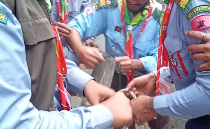 Membaca buku dengan anak Pramuka
