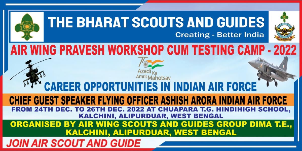 DIMA T.E.: AIR WING PRAVESH WORKSHOP CUM TESTING CAMP --2022, Air Wing Scouts and Guides Group of Dima T.E. Alipurduar District Association of West Bengal State Bharat Scouts and Guides was held at Chuapara T.G. Hindi High School, Kalchini , Alipurduar, West Bengal From 24th December to 26th December 2022. The camp was organized by Air Marshal Subroto Mukherjee Open Unit, Air Wing Scouts and Guides Group, Dima T.E, Alipurduar District Association, West Bengal.