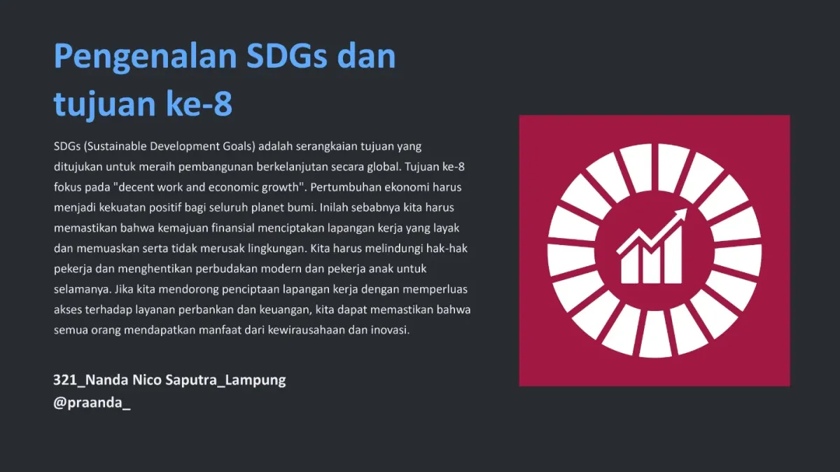 Goal 8 dalam Tujuan Pembangunan Berkelanjutan (TPB) atau yang dikenal dengan sebutan SDGS memiliki tujuan mendukung pertumbuhan ekonomi yang inklusif dan berkelanjutan, tenaga kerja penuh dan produktif dan pekerjaan yang layak bagi semua.