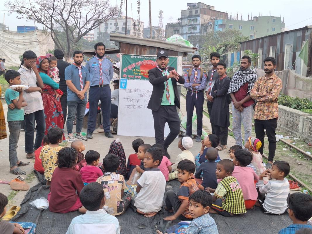 আলোকিত নারায়ণগঞ্জ মুক্ত স্কাউট গ্রুপের পক্ষ থেকে চাষাড়া রেল স্টেশনে স্থাপিত পথশিশু প্রাথমিক বিদ্যালয়ে নিরাপদ পানির ব্যবহার, প্রয়োজনীয়তা ও সঠিক সেনিটেশন এর প্রয়োজনীয়তা সম্পর্কে শিক্ষার্থীদের ধারণা দেওয়া হয়।