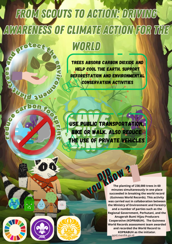 Hai, saya izzi dari gerakan pramuka indonesia. saya ingin menginspirasi dan mengajak orang lain untuk menjaga dan melestarikan lingkungan sekitar kita. maka dari itu saya membuat poster dengan tema "scouting for sdg's : messengers of peace for climate action". semoga ini dapat menginspirasi anda!