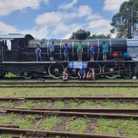 Cleaning off peeling paint and loose rust, undercoating and painting a 15AR Locomotive at the Hilton Steam Heritage Association.