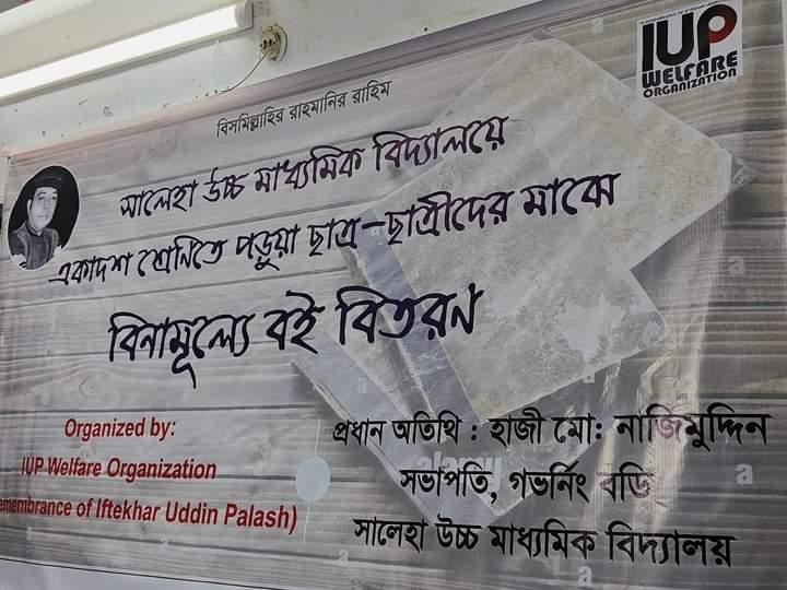 আলহামদুলিল্লাহ! গতকাল ১৯ অক্টোবর IUP Welfare Organization এর উদ্যোগে সালেহা উচ্চ মাধ্যমিক বিদ্যালয়ের একাদশ শ্রেণিতে পড়ুয়া ছাত্র-ছাত্রীদের মাঝে বিনামূল্যে ৫০ সেট বোর্ডের নতুন বই বিতরণ করা হয়েছে।