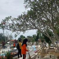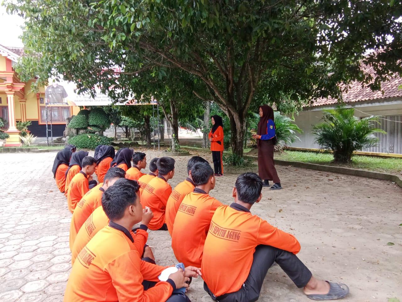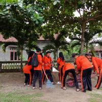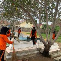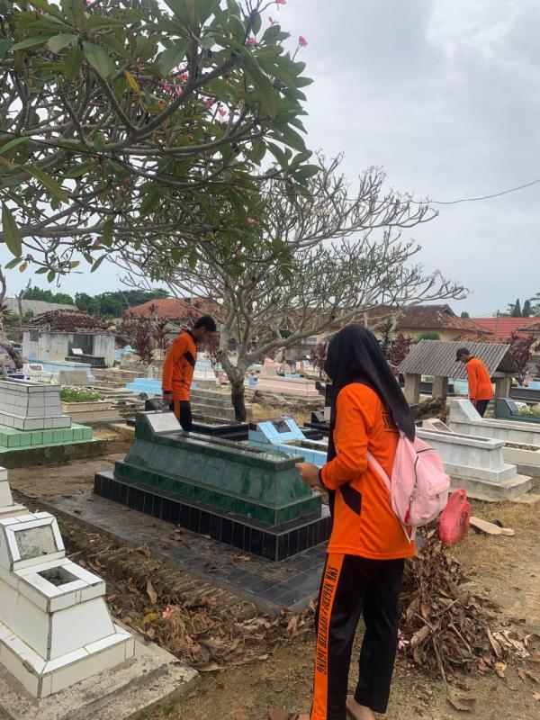 Pramuka SMKN 1 Seputih Agung bersama-sama membersihkan lingkungan sekitar, di antaranya makam dan tempat ibadah. Semua turut bekerja sama membersihkan lingkungan itu.