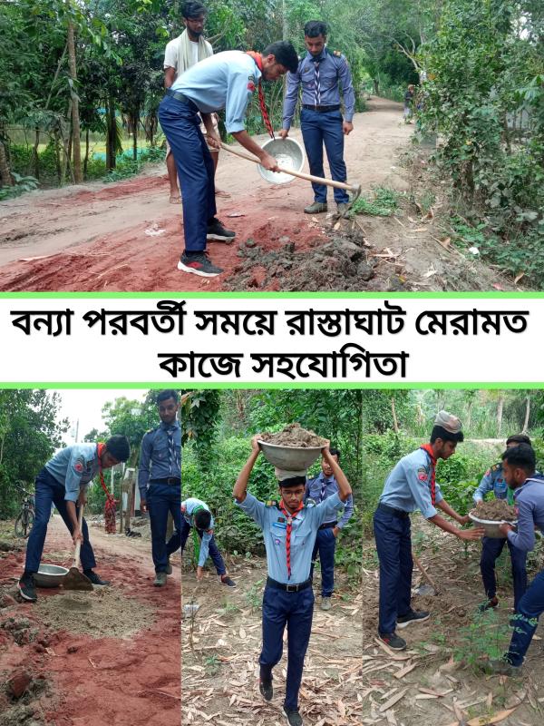 আমরা ৫জন রোভার সদস্য কুষ্টিয়া জেলার কমলাপুর বাজার সংলগ্ন এলাকার একটি রাস্তার বিভিন্ন স্থানে মেরামত কাজ করেছি। ফলে উক্ত এলাকার মানুষ খুব সহজেই রাস্তা দিয়ে চলাফেরা করতে সক্ষম হচ্ছে।