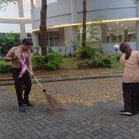 Kami membagi anggota menjadi 3 kelompok yang mana tiap kelompok berisi kurang lebih 10 orang tiap kelompok membersihkan gedung pariwisata seperti menyapu daun kering, mencabut rumput liar serta memunguti sampah plastik. Untuk daun kering daun rumput liar kami kumpulkan di bawah pohon untuk digunakan kembali menjadi pupuk organik dan untuk sampah plastik kami kumpulkan di dalam kantong sampah
