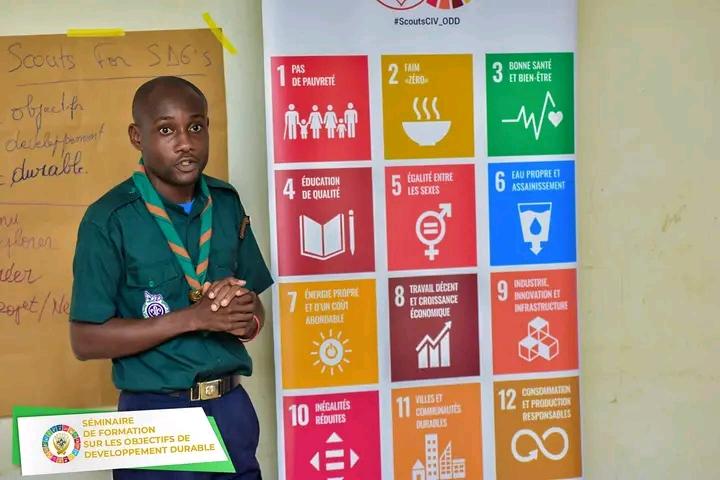 Pour atteindre les ODD, il faut des citoyens actifs du monde qui possèdent les compétences complexes nécessaires pour faire face aux grands défis à venir. Pour aider à développer ces compétences, l'éducation est essentielle. Mais plus requis, il est nécessaire de mettre en place une « pédagogie transformatrice adaptée vers l'action, qui soutient l'apprentissage autodirigé » (UNESCO, 2017). L'approche axée sur l'action et l'auto éducation du scoutisme est particulièrement bien placée pour aider les jeunes à devenir des citoyens actifs et à contribuer au développement durable. C'est dans ce contexte que j'ai été modérateur à un séminaire de formation organisé le 14 Mai 2022 à Abidjan par l'Association des Eclaireuses et Eclaireurs Evangéliques de Côte d'Ivoire. En tant que mouvement, le scoutisme est profondément ancré dans le contexte des communautés locales et capable de répondre aux divers besoins et aspirations des jeunes. 90 Jeunes ont décidé d'aborder les enjeux soulevées dans les ODD.