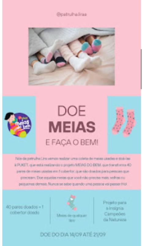 A patrulha Lira fez o folder da campanha para doação de meias velhas que são transformadas em cobertores que a empresa puket recolhe e transforma em cobertores que doa a pessoas necessitadas no inverno.
