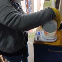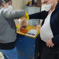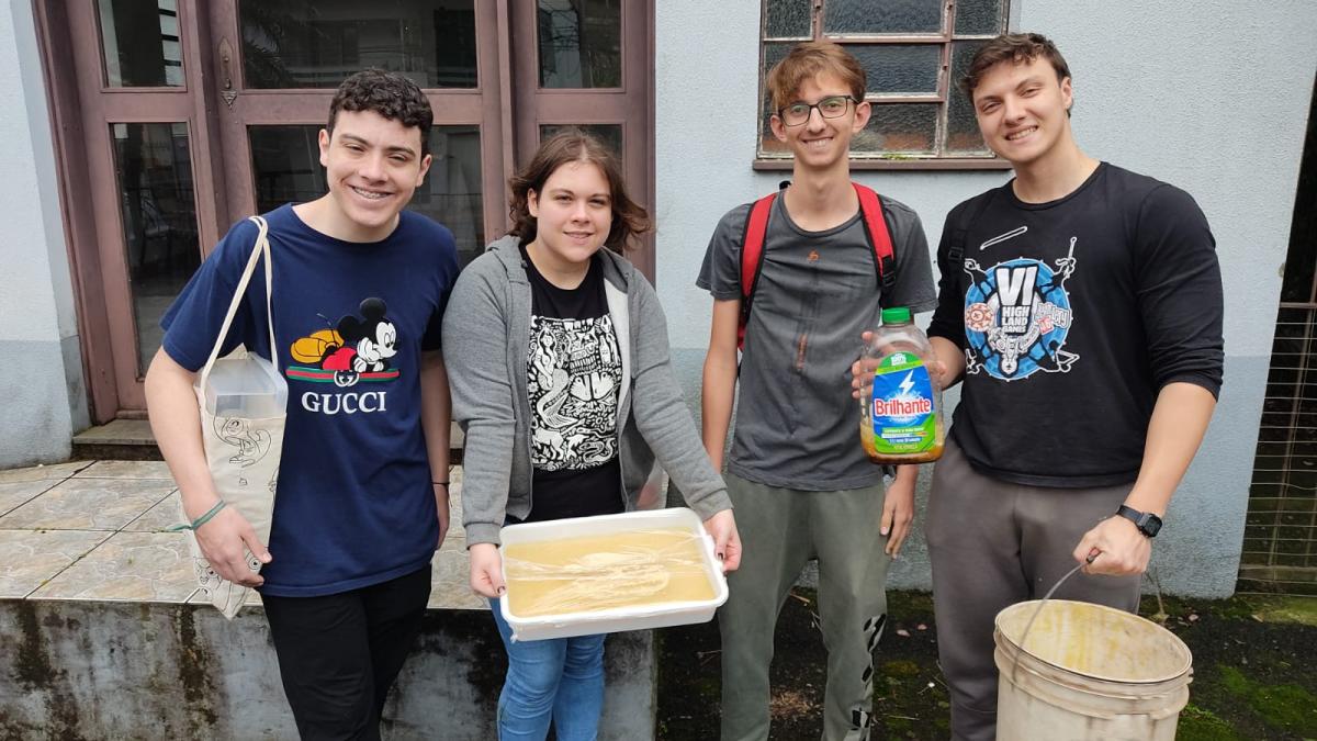A execução ocorreu na sede e no local de atividades. Para a reutilização do óleo usado, utilizou-se um béquer, no qual foi adicionada uma solução de hidróxido de sódio em água, preparada sob agitação até completa dissolução e homogeneização. Em seguida, acrescentou-se o óleo residual previamente coado, mantendo a agitação com o mixer até que a mistura atingisse uma consistência semelhante à de leite condensado, o que ocorreu, em média, após 30 a 40 minutos.
