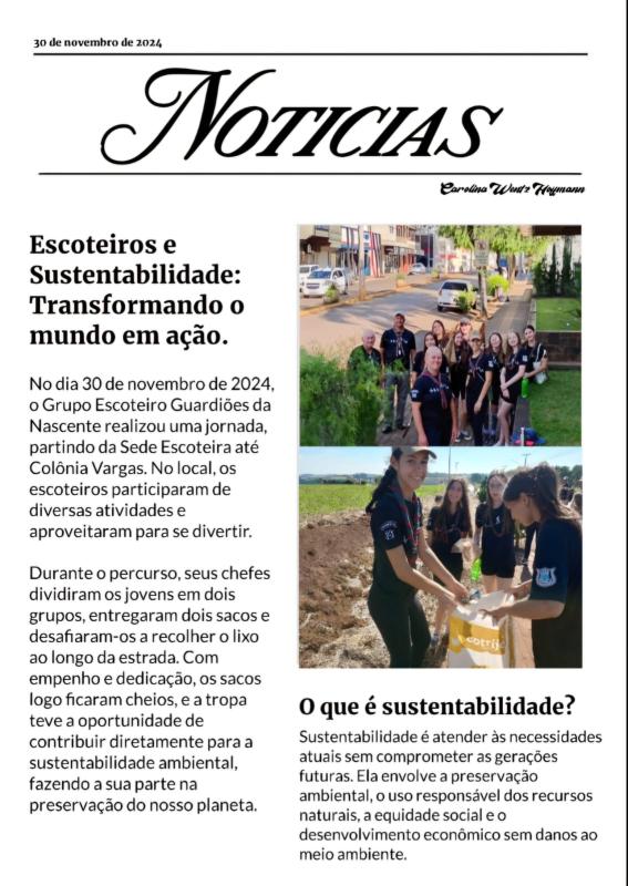 Em 30/11/2024, o Grupo Escoteiro Guardiões da Nascente fez uma jornada da Sede até Colônia Vargas, onde participaram de diversas atividades. Durante o trajeto, os jovens foram divididos em dois grupos e desafiados a coletar lixo pela estrada. Com dedicação, encheram os sacos rapidamente, contribuindo para a preservação ambiental.