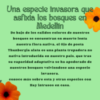 A la hora de realizar campamentos en la zona rural de Medellín se podía observar como cada vez mas aumentaba la población de un mismo tipo de planta, cosa que preocupa. pues cada vez se veía menos la variedad de flora que antes se encontraba. al investigar un poco nos dimos cuenta de que eran especies invasoras que dañaban nuestros ecosistemas, y que había muy poca información en la region acerca de esto.