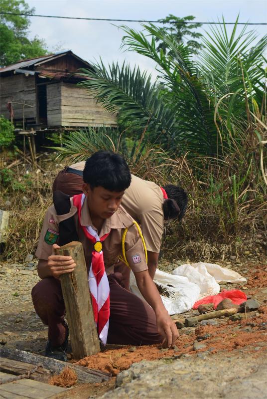 Pergantian papan lantai, pergantian rangka jembatan, serta penambalan jalan berlubang adalah salah satu bagian dari Pramuka kami memberikan pelayanan terhadap masyarakat, demi terwujudnya komunitas tanpa kemiskinan, meningkatnya ekonomi, dan kualitas hidup, serta memiliki infrastruktur yang tangguh.