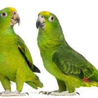Little green parrot looks just like his mom