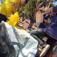 As lixeiras foram feitas pelos escoteiros com vasilhas reutilizáveis de produtos de limpeza de 5 litros presas às árvores com sisal de um jeito que podem ser viradas facilitando os seus esvaziamentos. A pintura foi feita para que ficassem mais visíveis no meio do parque.