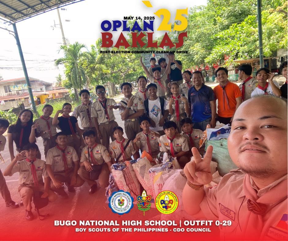 In a commendable display of civic responsibility and environmental awareness, Bugo National High School (NHS), under the leadership of BSP Coordinator Mr. Ellson A. Juntilla, Assistant Principal Mr. Arnold A. Lee, and Principal Dr. Judson M. Pastrano, mobilized 30 Senior Scouts to participate in a post-election cleanup drive. As a result of their collective efforts, 16 full sacks—amounting to a total of 52 kilograms—of election paraphernalia were successfully removed from public areas. This initiative not only helped restore cleanliness in the community but also reinforced the values of active citizenship, environmental stewardship, and youth engagement in nation-building.