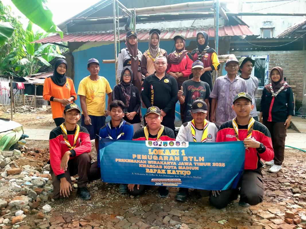 Dari kami rumah 1 Pramuka penegak dari kota madiun mengikuti kegiatan perkemahan wirakarya daerah Jawa timur 2025 karena kami ingin ikut serta mengabdikan diri serta menjalankan tri Satya dan dasa darma, yang akan mendorong kami untuk mengambil bagian dari kegiatan banyak warga membutuhkan bantuan dari Pramuka,agar rumah tersebut layak dihuni