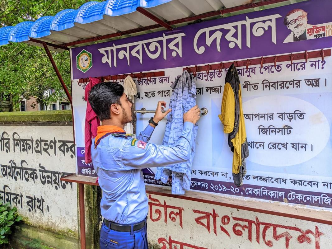 Members of Bogura Polytechnic Institute rover Scout Group initiated the create a "Humanity wall" programme on 10/11/2023 to 11/11/2023 at Colony , Bogura sadar, Bogura,12:30 pm in which 35 scouts participated actively. We collected some cloths and some things to implement this programme.