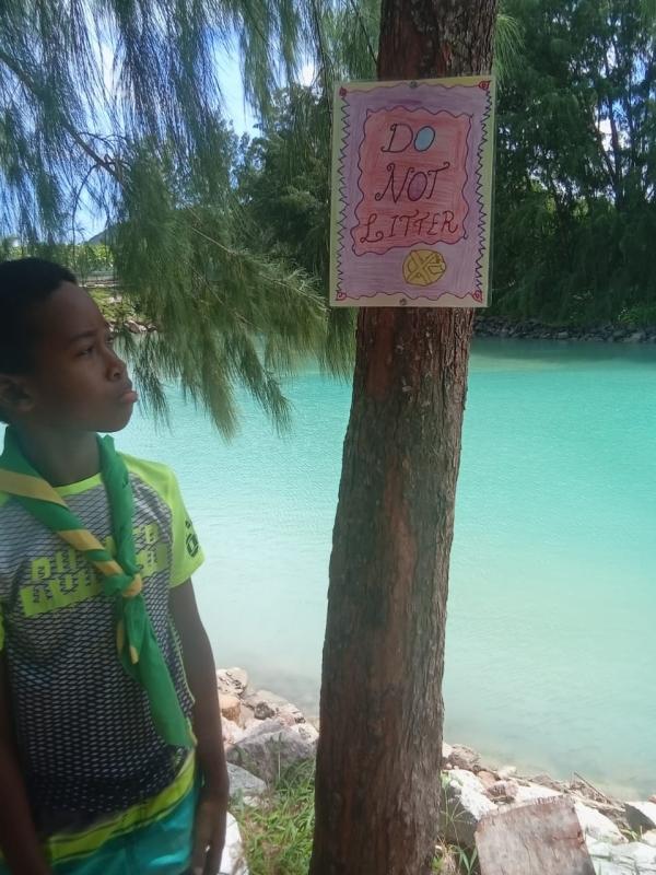 The Praslin scouts drew up posters to sensitize the public against littering. After cleaning up the allocated environment, which was a park frequently visited by the public and tourists, the scouts hang up their posters to encourage the public to keep the environment clean.