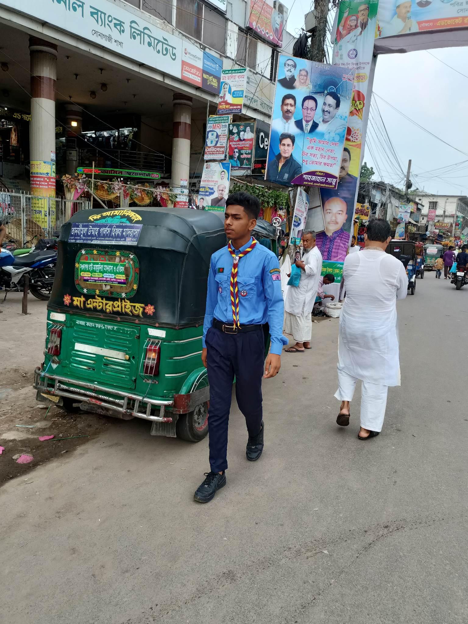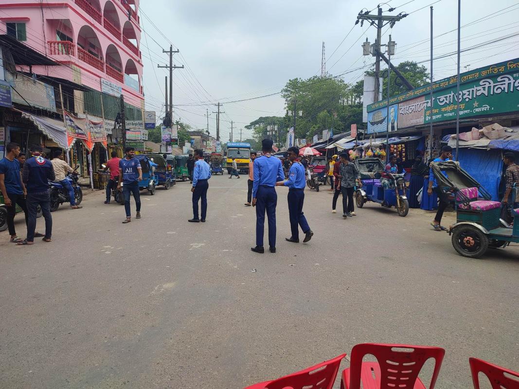 am a resident of Sonagazi. And this "traffic" is the daily companion of my city. And if it happens during a festival, it takes a very terrible form. Which happens during our two Eids. So every year Bandhan Mukt Scout Group works to decongest traffic in Sonagazi during two Eids.