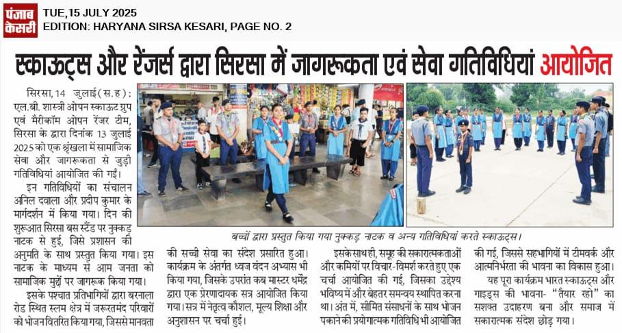 Activity Report Date: 13th July 2025 Groups Involved: L.B. Shastri Open Scout Group & Mary Kom Open Ranger Team, Sirsa Under the Supervision of: Mr. Anil Dawala, Mr. Pardeep Kumar Mr. Abhishek On 13th July 2025, a series of impactful activities were conducted in Sirsa. The day commenced with a Nukkad Natak at Sirsa Bus Stand (with official permission), spreading social awareness among the public. Following this, a food distribution drive was carried out in the slum area near Barnala Road, supporting underprivileged families. The participants then took part in a flag hoisting practice and an interactive session by Cub Master Dharmendra, focusing on values and leadership. A group discussion was held to review the strengths and shortcomings of the teams for better coordination. To develop survival and teamwork skills, a cooking activity using minimum resources was also organized. All activities were executed with discipline, enthusiasm, and teamwork, truly reflecting the essence of scouting and guiding. Happy Scouting ⚜️