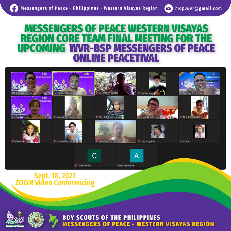 The Boy Scouts of the Philippines - Messengers of Peace Western Visayas Region Core Team met on September 18, 2021 via ZOOM Video Conferencing for their final meeting in preparation for the upcoming WVR-BSP Messengers of Philippines Online PEACEtival.