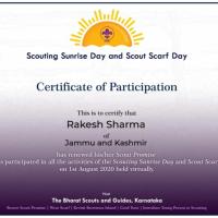 I, Rakesh Sharma Participated in Scouting Sunrise Day and Scout Scarf Day on 1 August, 2020 held Virtually by The Bharat Scouts and Guides , Karnataka and received this Certificate