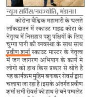 राजस्थान राज्य भारत स्काउट गाइड जिला कोटा के तत्वावधान में वैश्विक महामारी को रोना में निस्सहाय पशु पक्षियों के लिए चुग्गा पानी की व्यवस्था के साथ-साथ स्काउट मास्टर प्रवीण शर्मा के नेतृत्व में जन जागरण का कार्यक्रम एवं हाथ किस प्रकार धोते हैं यह कार्यक्रम एक मुहिम बनाकर रोवर्स द्वारा चलाया जा रहा है जिसके अंतर्गत स्काउट मास्टर प्रवीण शर्मा सभी रोवर्स को पंपलेट हाथ से बना कर दे रहे हैं और ज्यादा से ज्यादा जन जागरण करने के लिए प्रेरित कर रहे हैं सर्किल ऑर्गेनाइजर प्रदीप चित्तौड़ा वह प्रीति कुमारी जोर शोर से मास्क के कार्य को करवा रही हैगांव-गांव में प्रेरित कर रही है कि बिना मास्क के नहीं रहे इसके अलावा स्काउट द्वारा इसको रोना महामारी से लड़ रहे पुलिसकर्मियों को चाय नाश्ते की व्यवस्था में भी अग्रणी रह रहे हैं इन सब कार्यों को देखते हुए सहायक राज्य संगठन आयुक्त पूर्ण सिंह शेखावत ने सर्किल ऑर्गेनाइजर प्रदीप चित्तौड़ा प्रीति कुमारी को बहुत-बहुत शाबाशी एवं धन्यवाद दिया शेखावत ने कहा कोटा जिले के दोनों सर्कल ऑर्गेनाइजर कर्तव्य निष्ठा के साथ इस महामारी में अपने रोवर स्काउट गाइड रेंजर ट्रेनिंग काउंसलर व सचिव साहबान के साथ समन्वयक बनाकर कार्य कर रहे हैं |