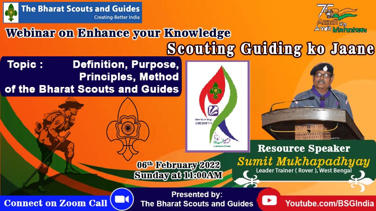 WEBINAR TO ENHANCE OUR KNOWLEDGE OK SCOUTING GUIDING Scouting & Guiding ko jaane Webinar 2 on Definition, purpose, fundamentals & methods of The Bharat scouts and guides. bsgindia