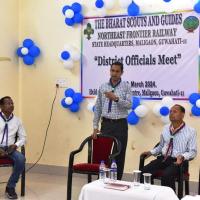 On 18th March 2024, District Officials Meet was held at State Training Centre, BSG/NFR Maligaon, Guwahati-11, The Meeting was graced by State Chief Commissioner, BSG/NFR & Chief Personnel Officer/IR/ Shri Sasanka Sarmah, State Secretary & APO/Welfare Shri Ajaya Kr. Bastia, Jt. State Secretary & Ex. SPO/Rectt Shri C.S. Pandit along with State Officials and District Officials present from 09 nos of District Associations of BSG/NFR. The meeting commenced with the flag hosting, in accordance with our Scouting Tradition. Thereafter, District Officials expressed their views and discussed the issues faced in their respective districts, also assuring for the all-round growth and development of their district associations under the guidance of our new State Chief Commissioner. The Meeting came to end as by lowering of flag followed by National Anthem as per the scouting tradition. A total of 50 nos of Rovers, Rangers, District officials, State Officials actively participated in the programme.