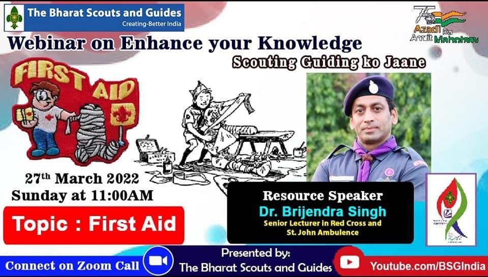 27 Mar: 🌏 ENHANCE YOUR KNOWLEDGE- SCOUTING GUIDING KO JAANE🏢- Series of webinar Organizing by BSG India. Today's webinar on Topic- 🌐FIRST AID.🏞️