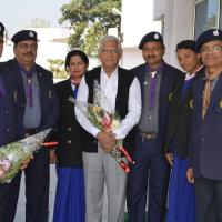 Shri B.I.Nagarale, Chief National Commissioner felicitated Shri. K.C. Devasanapati, IAS Collected Dantewada, Dr. Sharansh Mitter, IAS, CEO Jila panthayat, Dr. Anand ji Singh, Assistant Commisioner Tribal / D.C. Scout, Smt. Shainy Ravender, DOC (G) and Shri S. L . Shori DOC(S), Dantewada with honor plaque, Shreephal and shawal for their excellent leadership and initiative to start Scouting / Guiding in Pota Cabins Schools (Naxil effected orphanages schools) amid dense forest.