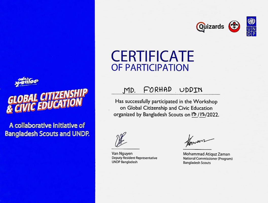 I was successfully participated in the workshop on global citizenship and civic education. Organised by Bangladesh Scouts on 13/12/2022.