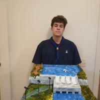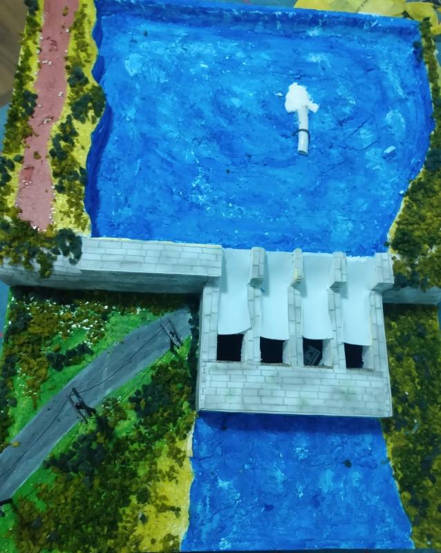 é uma maquete de uma hidrelétrica, mostrando que podemos ter acesso a energias renováveis. A maquete demonstra um pouco sobre como as hidrelétricas funcionam.